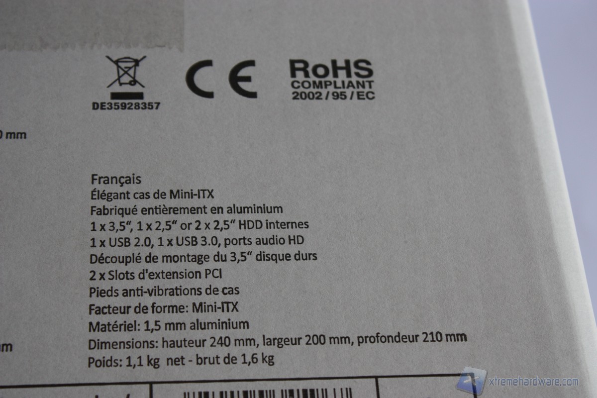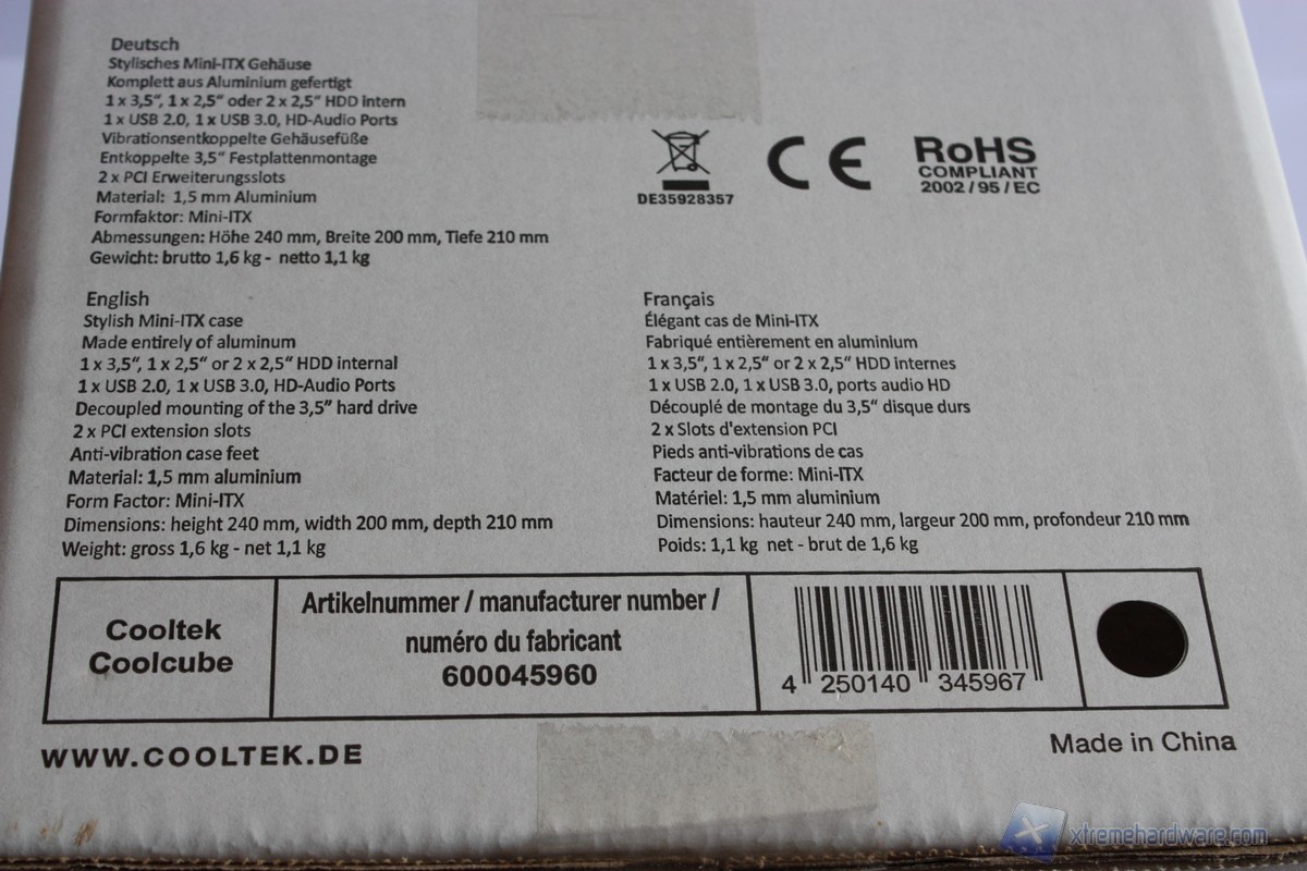 Andiamo ora ad analizzare nel dettaglio la confezione del Coolcube. Come possiamo notare la confezione riprende la forma cubica del case in esso contenuto. Nella parte frontale, ma anche su gli altri lati della stessa sono sempre presenti il logo del brand Cooltek e il modello con la tipologia del case. Nella parte frontale troviamo un disegno del case con a lato le caratteristiche principali nonchè la scritta "Full Alluminium" che non lascia dubbi sul materiale strutturale del case. Nella parte posteriore della confezione invece troviamo un altro disegno con l'"esplosione" dei vari pannelli con relative caratteristiche tecniche e spiegazioni. Notiamo inoltre come il comparto storage, quindi i dischi che verranno montati, è posto nella parte bassa e quindi alla base del cubo, rendendo cosi più facile l'espulsione di calore anche grazie alle feritoie presenti. Ambo i lati della confezione troviamo in tre lingue ovvero tedesco, polacco e francese, le caratteristiche tecniche del Coolcube che rendono sin da subito le dimensioni molto compatte e quindi ideali per qualsiasi collocazione. Vengono inoltre menzionati i codici prodotto,seriali e il colore, nonchè i loghi tra cui RoHs che ci indica che il case non è stato realizzato con metalli pesanti come il piombo o altri che possono essere dannosi per la salute dell'utente.