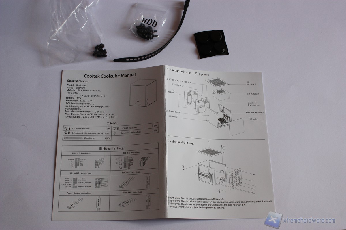 Passiamo ora ad aprire la confezione. Come notiamo appena aperta la confezione troviamo subito il manuale su un unico foglio il quale ci indica come smontare il case ed il bundle in esso contenuto. Il case è protetto da delle forme in gomma bianca che lo proteggono al loro interno e in più è presente la classica busta trasparente contro la polvere, ulteriori danni o lesioni che potrebbero presentarsi sulla struttura del case. Il bundle è essenziale, ma sufficiente per l'installazione e l'assemblaggio dei componenti all'interno del case.