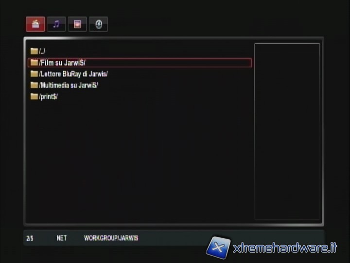 queste Queste tre voci del menù servono per raggiungere i file da riprodurre, i cui elenchi poi vengono visualizzati per categorie (audio, video ecc..), visibili in alto e selezionabili tramite i tasti DESTRA e SINISTRA sull'anello centrale del telecomando.